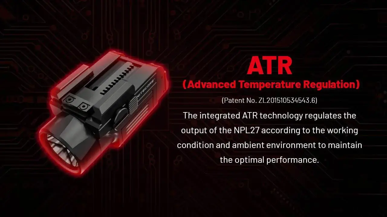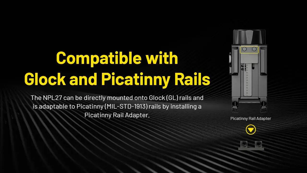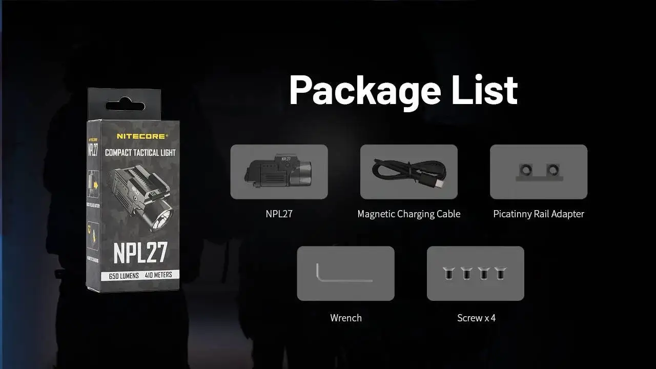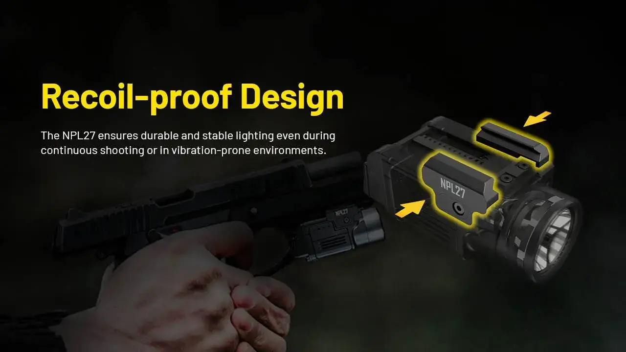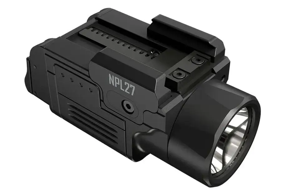 פנס אקדח טקטי מתקדם מדגם NPL27 מבית Nitecore, המיועד לשימוש מבצעי בתנאי שטח מגוונים. מספק תאורה חזקה במיוחד בעוצמה של 650 לומן עם טווח הארה מרשים של עד 410 מטר.