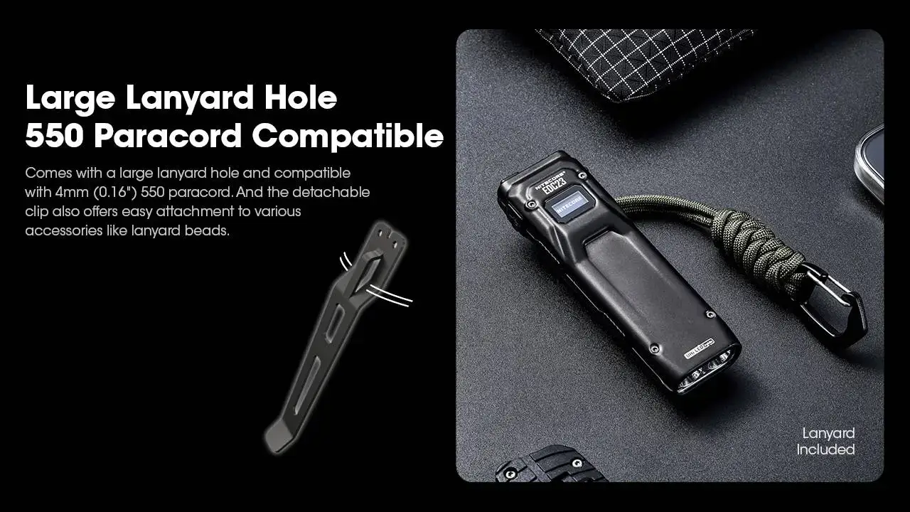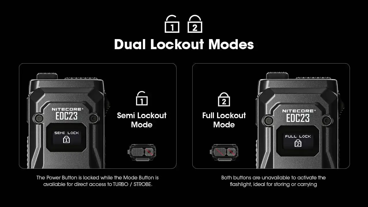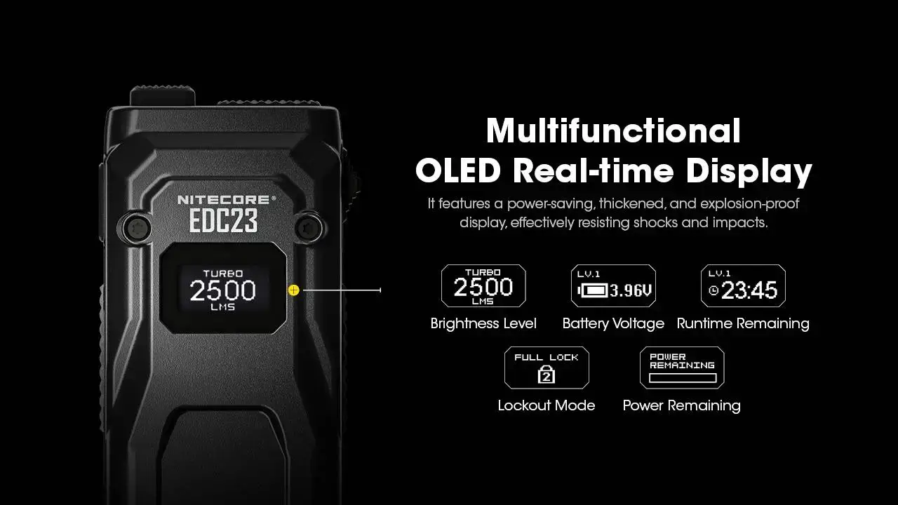 הפנס כולל מסך OLED המציג נתונים בזמן אמת כגון מצב סוללה, עוצמת תאורה וזמן עבודה, וכן מנגנון נעילה כפול למניעת הפעלה לא רצויה.