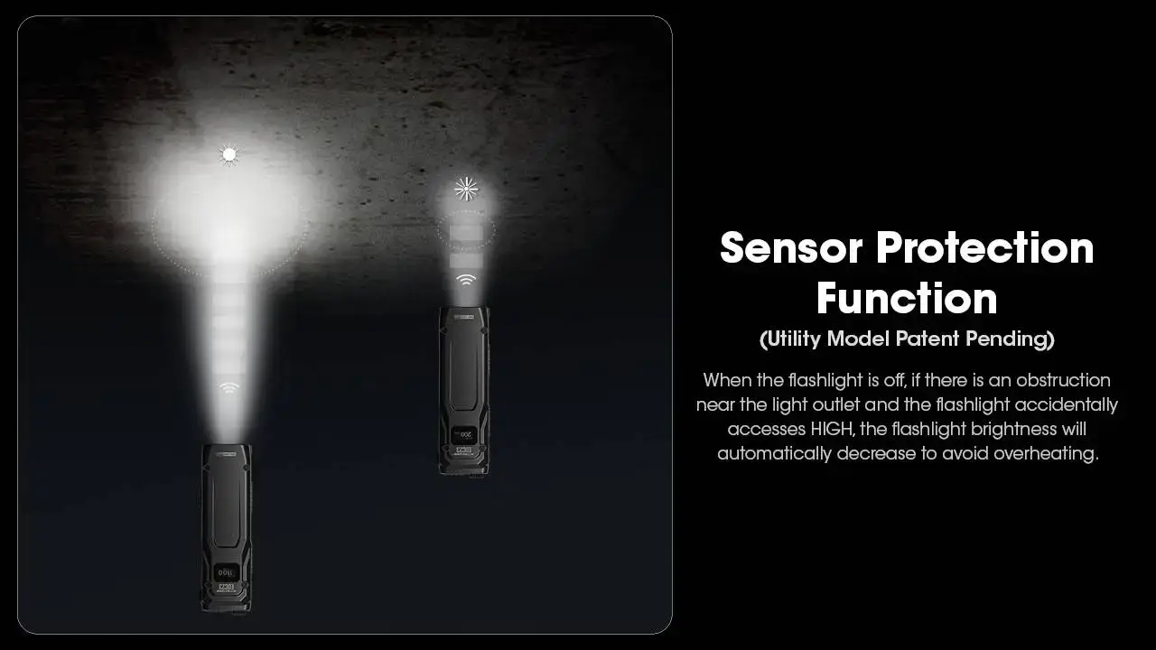 מצב LUMEN SHIELD מספק פרץ אור חזק במיוחד לזמן קצר, ואילו חיישן קירבה מובנה מגן על המשתמש והפנס בעת שימוש בטווח קרוב.