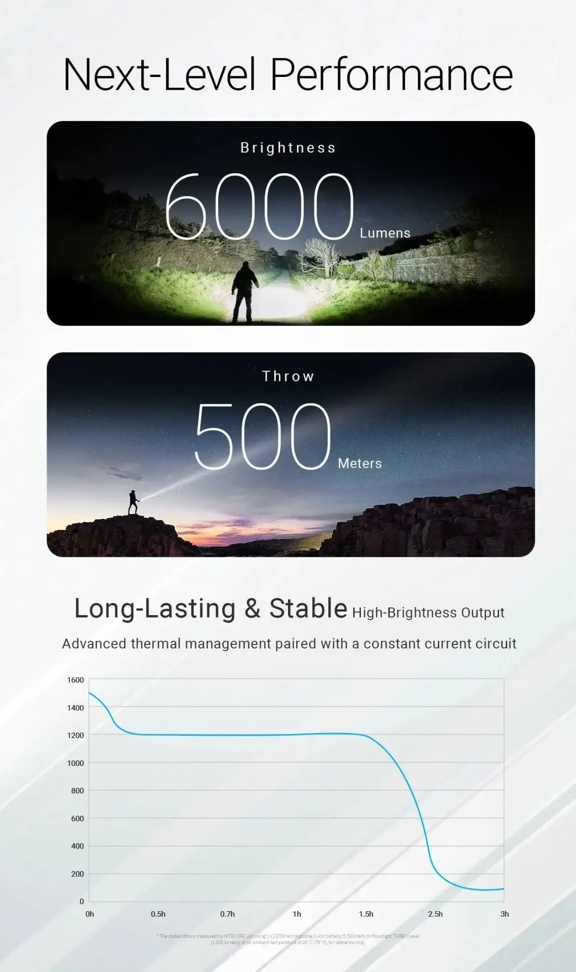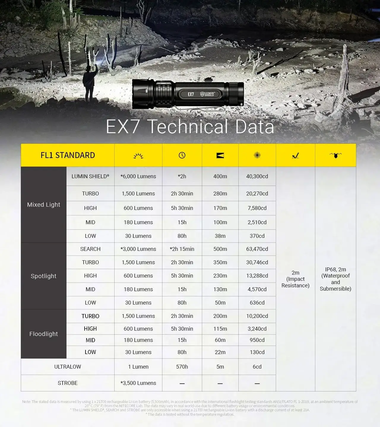 פנס יד Nitecore EX7 בעוצמה 6000 לומן עם טווח עד 500 מטר, כולל מצבי הצפה, חיפוש ו-STROBE, בסיס מגנטי וטעינה USB-C.